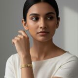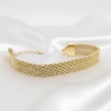 Make a sophisticated statement with the Luxe Mesh Cuff Bracelet from Gehnay. This stunning piece of artificial jewelry features a wide, finely woven mesh band that sits elegantly on the wrist, mimicking the look of liquid gold.
