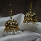 Elevate your desi attire with the Royal Ivory Jhumka Earrings from Gehnay. These traditional Jhumkas feature the beautiful, classic bell shape, offering a timeless look perfect for weddings, Eid, and festive gatherings.